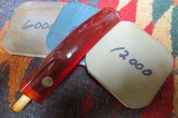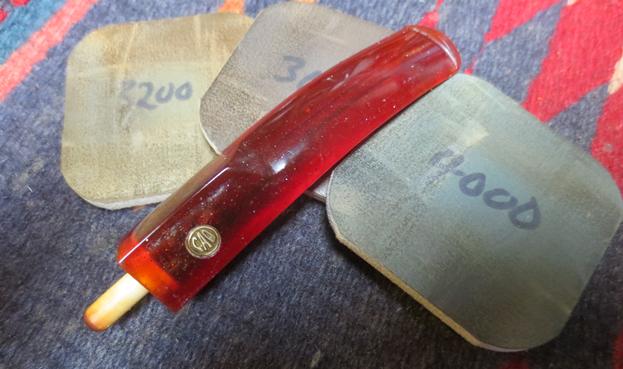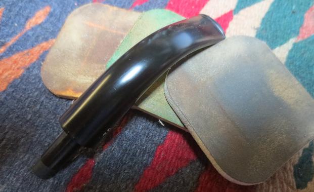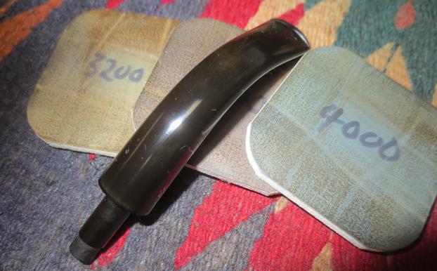 I put aside the bowl and turned back to the stem. I removed it from the deoxidizer soak and dried it off with a cloth. I rubbed off the remaining oxidation and then cleaned out the airway with alcohol and pipe cleaners. The stem looked really good at this point. It would not take too much work to bring it back to a rich shine. I polished the vulcanite with micromesh sanding pads – wet sanding it with 1500-2400 grit pads and dry sanding it with 3200-4000 grit pads. I wiped the stem down with Obsidian Oil after each sanding pad. I buffed the stem with Blue Diamond on the buffing wheel. I brought it back to the table and sanded it with the final three 6000-12000 grit pads. After the final pad I gave it a final coat of oil and set it aside to dry.
