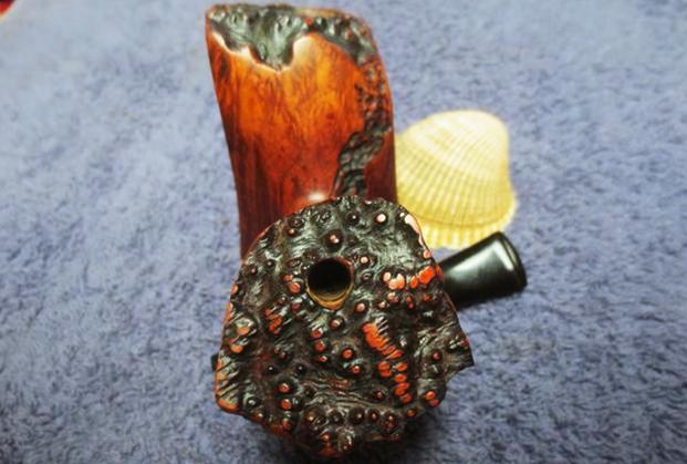 I went through a period where I bought some cracked bowls to recreate or repair the pipe. I shortened billiards to make pots and cut off the broken parts and rejoined a different bowl part to the top of the cut of bowl. I used pins and pegs to bind the two parts together. I learned to drill and stitch cracks in the bowls along with Charles Lemon of Dadspipes. I learned to repair interior cracks in the bowl with a variety of methods.