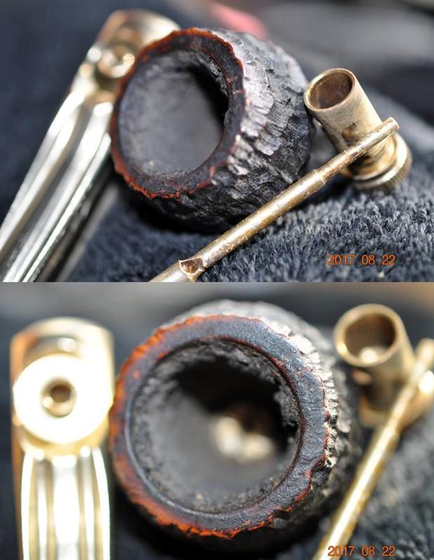 To top it off once the painted finish is removed I have found that the paint hid a multitude of flaws in the briar that have been filled and masked by the paint coat. It is generally a disappointment to me after all the work on the briar to get to that point. Instead, if I am left with a damaged painted pipe I generally rusticate it and thus remove the issue. I know that the solution may not be acceptable to all of you but it is what I do with this problem.
