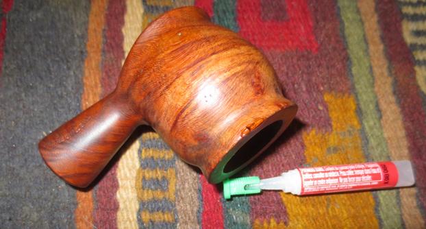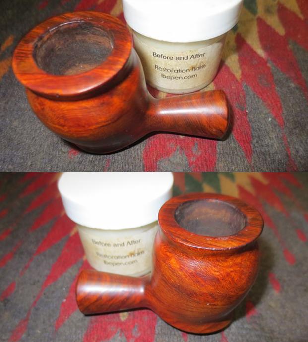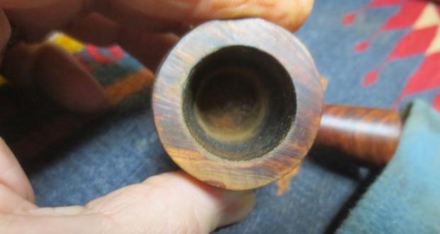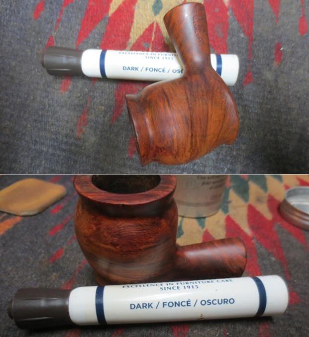 I stained the sanded areas with a dark brown stain pen to match it to the rest of the stain on the briar. I hand buffed it with a soft cloth to raise a shine.