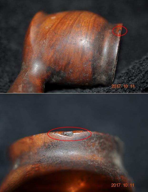 He took a close up photo of the rim top and bowl. You can see the thickness of the cake in the bowl and the heavy lava coat on the top. The bowl exterior was also caked with tars and grime around the groove around the top of the bowl. Jeff also took photos of the sides of the bowl to show the condition of the pipe. The first four photos show the damaged area on the top edge of the right side of the bowl. I have circled the damaged areas in red on the photos to highlight the issue. The fifth photo shows the underside of the bowl. The grain is quite beautiful and shows through the grime on the finish.