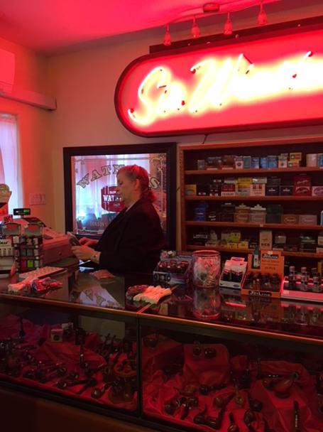 On the wall behind the counter and under the neon Sir Winston sign was the select of tailor made cigarettes from around the world. There was also a large Watney’s Ale mirror on the wall that added a nice touch and gave the proprietress a good view of the shop when she was at here counter.