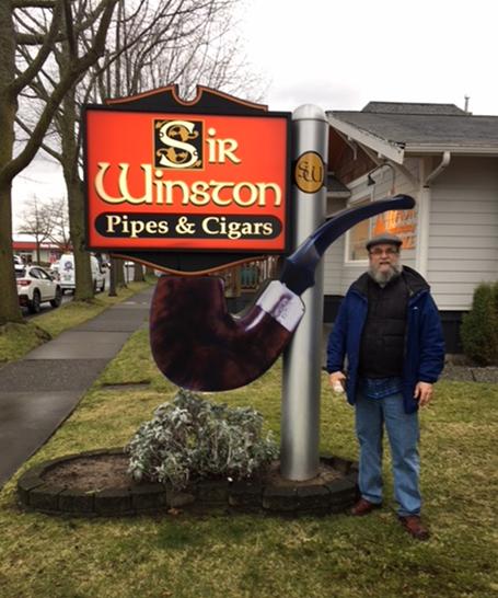 I googled pipe shops in Bellingham and there was one that came up that was not too far away from the old Senate location. In fact the app said it was a 7 minute drive. It said the shop did not open until 11am so we stopped by a coffee shop and relaxed while we waited for the shop to open. While we sat there I read some of the online reviews of the shop and looked through the photos. The shop was called Sir Winston Pipes & Cigars. The photos showed some bulk tobacco. As we got closer to 11 o’clock we headed over to the shop. It was located at 2122 James St. in Bellingham, WA. It was an interesting neighbourhood – residential dwellings surrounded by light industrial buildings. It was on a busy four lane street. We found the address and a parking place in front of the house. The sign in the front yard caught my attention. It was bright red sign that read Sir Winston Pipes & Cigars. It hung by its right side from what looked like a silver cigar tube with the SW (Sir Winston) label on the tube. There was a large Peterson’s style system pipe hanging below the sign – dark brown bowl, silver ferrule and a black stem.