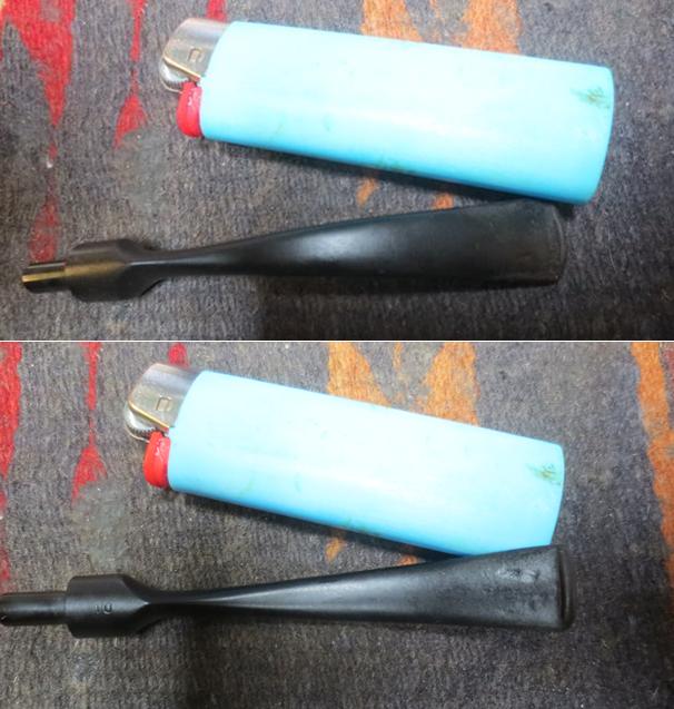 I took the stem out of the bath of Before & After Pipe Stem Deoxidizer and wiped it down with a paper towel to remove the excess deoxidizer. I ran pipe cleaners and alcohol through the airway to clean out the buildup inside. The stem was very clean and the oxidation was gone. The tooth marks in the surface of the stem on both sides near the button were visible.