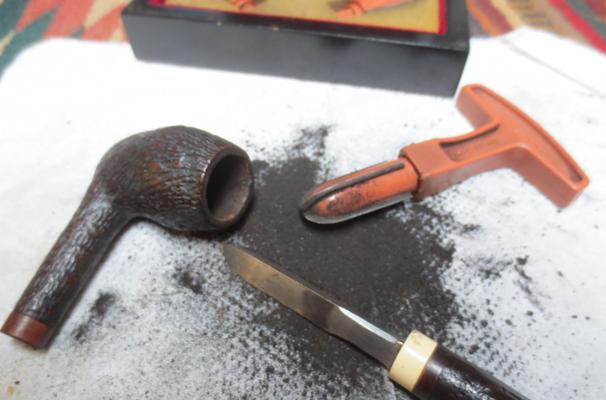 I turned my attention to the bowl and the cleanup that was awaiting me there. I reamed the bowl with a PipNet pipe reamer using the smallest cutting head to work away the heavy cake. I worked at it very slowly so as to keep the blade from ruining the roundness of the bowl and to keep from splitting or damaging the delicate bowl. I finished up the reaming with a Savinelli Fitsall Pipe Knife taking the cake back to bare briar and smoothing things out. I used a folded piece of 180 grit sandpaper to work on the inner edge of the rim and smooth out that edge of the bowl and down into the bowl about an inch.