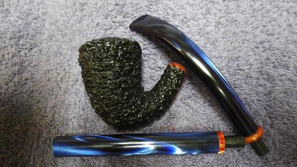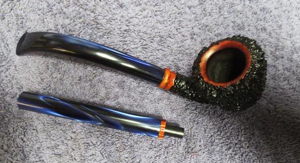 My brother picked up this nice rusticated Brebbia Twin 2 because of the beautiful cobalt blue stem. It is a twin in that it can be smoked as a Churchwarden with the long stem or by simply removing the lower part of the stem it can be smoked as a regular length bent pipe. The rustication is very tactile and rugged looking – similar to the Brebbia Lido finish. The mixture of dark black and brown stains gives the bowl an interesting contrast finish. The top of the rim is beveled inward and is smooth. It also has the same brown stain as the shank end and underside. It is a great contrast to the surround black rustication of the bowl and shank. The end of the shank is smooth and rounded while the smooth panel on the underside of the stem is stamped with the pipes identification. In this case it reads Italy, Brebbia Twin 2. The long insert portion of the stem is made out of cobalt blue acrylic and has a small multi-coloured brown acrylic ring attached to the end. The extension has a Delrin tenon that holds it in the shank. The second part of the stem has a briar ring attached to the end of the stem and also a Delrin tenon. The left side of the stem has the Brebbia gold diamond shaped logo stamped in it. All of the parts work well together and give the pipe an elegant look. Jeff took some photos of the pipe before he cleaned it up and sent it to me.