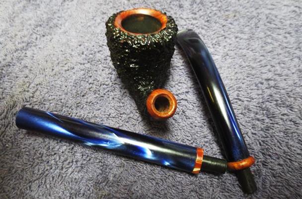 The rich cobalt blue stem and extension are one of my favourite parts of this pipe. The colours of the bowl, rim, shank end, acrylic spacer and briar spacer work really well together with the blue of the stem material.