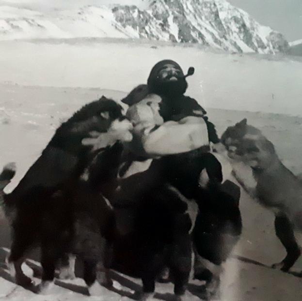She sent along this photo of him with his sled dogs in the Antarctic sometime in 1953-1954. It is a fascinating photo showing him with a pipe in his mouth. He is happily rough housing with his dogs. As a true pipeman the cold does not seem to bother him at all.