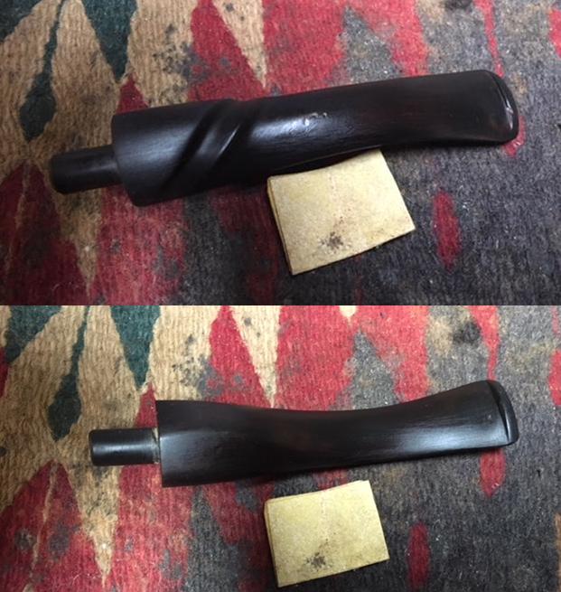 I painted the surface of the stem with the flame of a Bic lighter to lift the tooth dents in the underside of the stem. It took a few swaths of the lighter and the dents lifted. There was only one small pin prick left next to the button that would need to be repaired.
