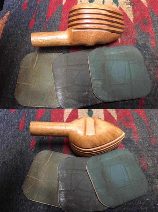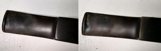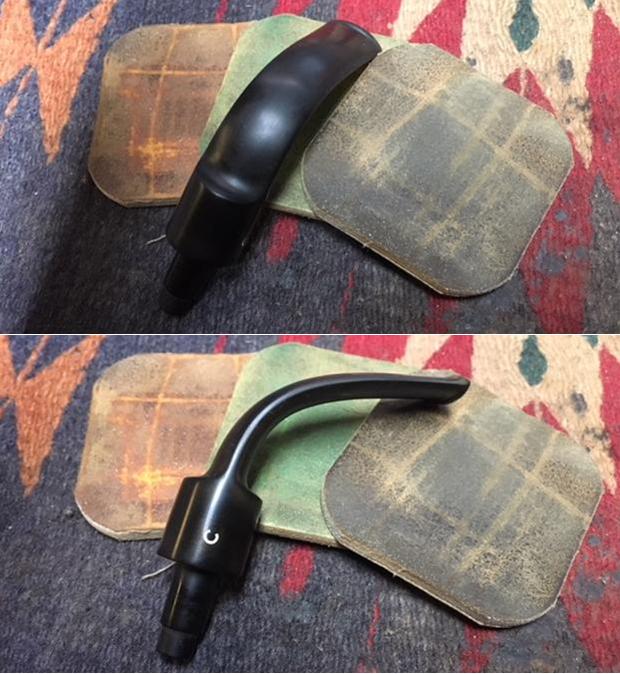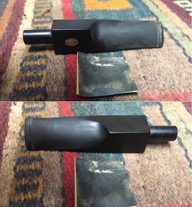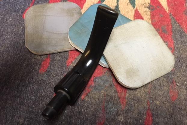 I started working on the stem next. I sanded out the tooth chatter next to the button on both sides with 220 grit sandpaper. I wiped the stem surface clean with a damp cloth. I sanded it with 400 grit wet/dry sandpaper to blend the scratches left behind by the sandpaper and blended the scratches into the surface of the vulcanite.