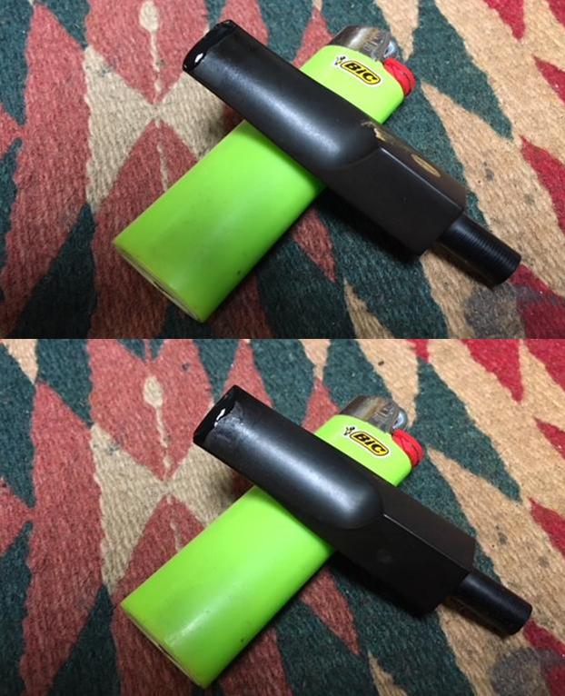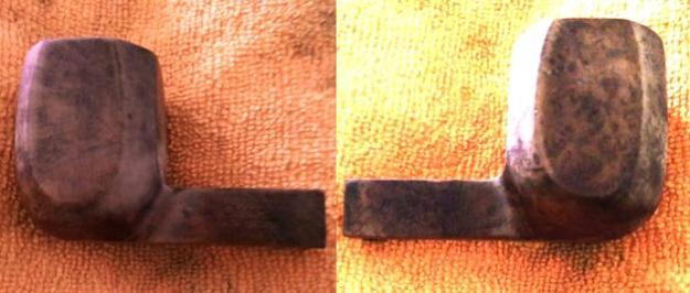 The stem was made of hard rubber and was barely oxidized as mentioned above and had tooth chatter on both sides near the button. Jeff took photos of both sides of the stem to capture their condition before he cleaned the pipe. The small white spot on the top of the stem was in good condition and slightly indented.