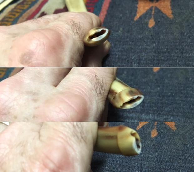 I repaired the chipped areas on the tenon end of the stem with clear super glue. Once the glue had cured I sanded the repaired areas to remove the excess and blend it into the surface of the horn.
