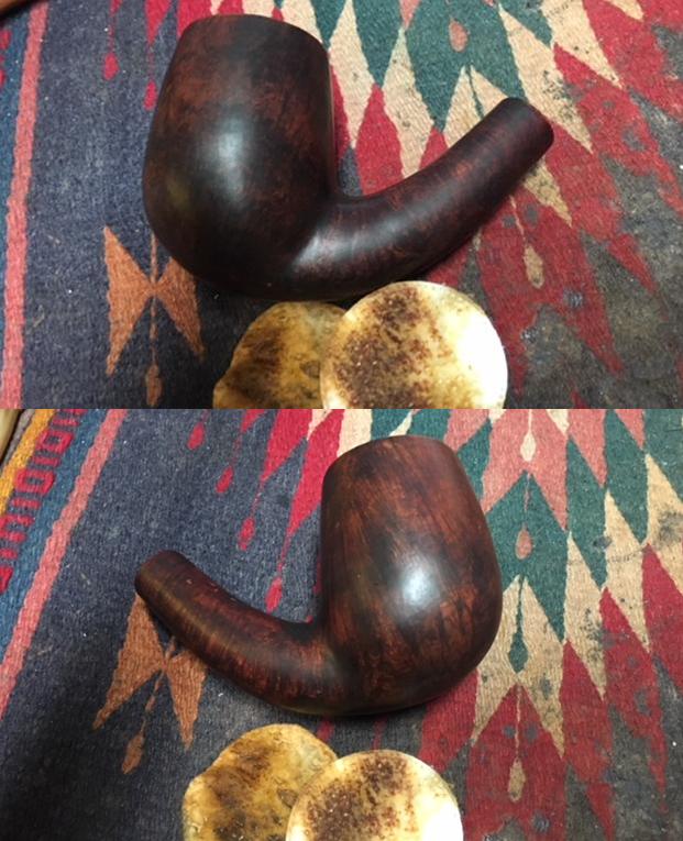 Jeff took some photos of the pipe before he cleaned it up. It was in pretty good condition. The bowl had a light cake but there was no lava overflow on the rim top. The varnish finish on the bowl was peeling and spotty. The grain on the sides of the pipe was really nice. There were a lot of fills on the bottom and back sides of the bowl and all along the sides of the shank. On the underside of the shank and on part of the bottom of the bowl there were some very large fills that were chipped and damaged.