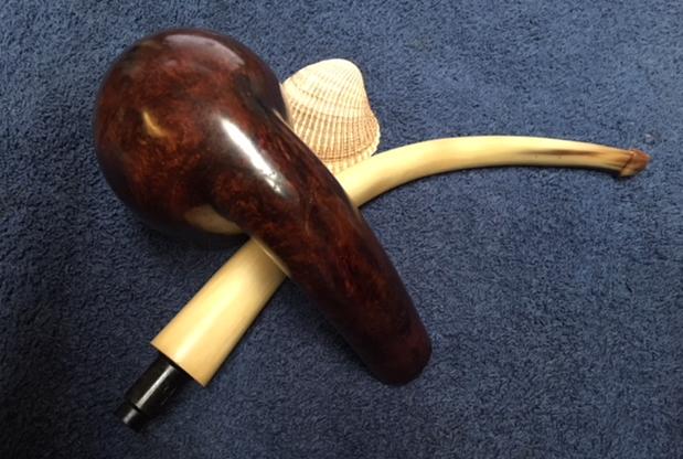 I took the pipe to the buffer and worked it over on the buffing wheel using Blue Diamond to polish it. I buffed the entire pipe to raise the gloss on the briar and really bring shine to the horn. I gave the bowl and stem multiple coats of Carnauba Wax. I buffed the entire pipe with a clean buffing pad to raise the shine. I hand buffed it with a microfiber cloth to deepen the shine. The finished pipe is shown in the photos below. The dark brown stains on the bowl do not hide the grain and the fills though present do not stand out as much. The bowl and the rich striated colours of the horn work really well to create a rich looking pipe. The pipe is so big that I want to once again give you the dimensions; Length: 12 inches, Height: 3 ½ inches, Outside Diameter of the Bowl: 2 inches, Diameter of the Chamber: 1 ½ inches. This humongous briar and horn stem pipe is truly a beauty. I have never seen a pipe this big before and it makes me wonder if it was not originally made as a display pipe. I don’t think I will ever know for sure but I do know that it was smoked and it is available to anyone who is interested in adding big pipe to their own collection. I would have said rack but it is too big to fit even a large rack. I will be putting it on the rebornpipes store shortly so if you are interested let me know. Thanks for walking through the restoration with me.