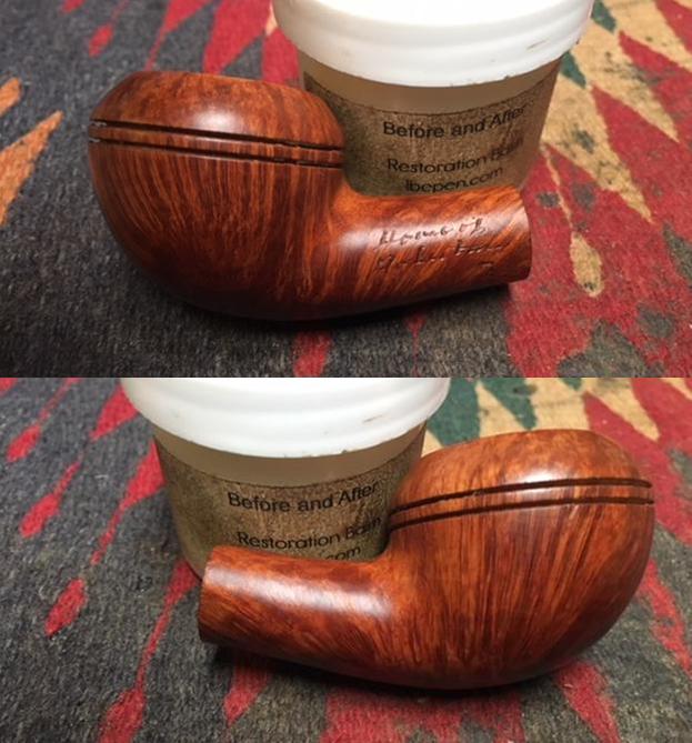 I rubbed the bowl down with Before & After Restoration Balm to deep clean the finish, enliven and protect the briar. I hand rubbed it with my fingers, worked it into the finish with a horsehair shoe brush. I wiped it off with a soft cloth. I buffed the bowl with a horsehair shoe brush to polish it. It really began to have a deep shine in the briar. I took some photos of the bowl at this point to mark the progress in the restoration. The birdseye grain stands out on the two sides and the cross grain stands out on the rim top, the front and back of the bowl and the top and underside of the shank.