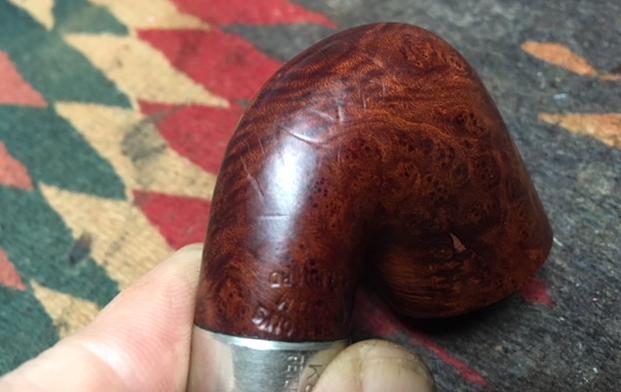 The finish on the pipe was very dirty with a lot of dents on the bottom side of the bowl and shank. There was a long deep dent on the front of the bowl. The bowl had a very thick, hard cake that had overflowed onto the rim top. The bowl was out of round and the inner bevel was burned and damaged. It looked as if some had tried to ream the bowl with a knife sometime in its life. There were two fills – one on the back left and one on the back right. In the angle of where the shank and bowl connected there was a heavy oily grime build up. The inside of the shank and sump were filled with tars and oils. The nickel ferrule was in great condition with light scratching but no real oxidation. The stem was a mess. The top side of the stem had deep tooth grooves extending forward from the p-lip button about 1 inch. On the underside there were also tooth marks. Both sides had a lot of serious chatter and some calcification build up. The stem was oxidized and very dirty. I took some photos of the pipe before I started working on it. I took close up photos of the rim top and the stem to show the condition it was in when it arrived in Vancouver. You can see the heavy lava buildup on the rim top. You can also see the damage on the inner edge, particularly heavy on the right front side. The cake was quite thick and very hard leaving barely enough room for my little finger to fit in the bowl. You can see the condition of the stem and the tooth marks in the oxidation on both sides. The tooth marks and chatter on both sides are deep and worn looking.The stem was stuck in the shank and would not move. I tried to twist it and turn it but nothing moved. I put the pipe in the freezer for half an hour let it do its magic. At the end of the half hour I was able to easily remove the stem from the shank.I decided to soak the stem in a bath of Before & After Pipe Stem Deoxidizer so I dropped it in the airtight container and set it aside overnight to let it do its work.I turned my attention to the bowl. I started by reaming the hard cake back with a PipNet pipe reamer. I started with the smallest cutting head and worked my way up to the second head. I took the cake all the way back to bare briar. I cleaned up the remnants in the bowl with a Savinelli Fitsall Pipe Knife. The knife allowed me to get all the way to the bottom of the bowl and remove the cake that still remained around the airway.I topped the bowl on a topping board with 220 grit sandpaper. I worked on it until I had removed the damage on the top of the rim and was able to minimize the damage to the inner and outer edges of the bowl. I used a folded piece of sandpaper to rework the inner edge of the bowl and give it a slight bevel to hide the burn marks and the damage from the knife reaming. With a little work I was able to remove the damage on the inner edge of the bowl. I also ran the folded sandpaper around the outer edge to smooth out the nicks and marks.The briar on the bowl had some dents around the sides, front and back of the bowl. The underside of the shank was also dented. Before I dealt with the dents in the surface I decided to polish the briar and raise a shine. I wet sanded it with 1500-2400 grit micromesh sanding pads and dry sanded it with 3200-12000 grit pads. I wiped it down after each pad with a damp cloth to remove any sanding dust. The grain in the briar really began to stand out. There was some really nice birdseye on the sides of the bowl and cross grain on the front and back sides. I used a cherry stain pen to restain the rim top to match the colour of the rest of the bowl. I have found that this particular cherry stain perfectly matches the colour of the Peterson’s System Standard pipe.I cleaned out the inside of the shank, the sump and the airway into the bowl with pipe cleaners, cotton swabs and alcohol. It took a few of each but after while the cleaners and cotton swabs came out clean and the pipe smelled fresh.With the internals clean and the externals clean I decided to address all of the dents in the briar on the bottom and front of the bowl. I took photos of the dents to give an idea of the sheer number of them all around the shank, bowl bottom and up the front. They were all quite rounded dents rather than cuts so I figured that I could steam most of them out. I use a wet cloth (not dripping but enough to make steam when heated) and a hot butter knife to steam the dents. I heated the knife over a flame on my gas stove, put the wet cloth over the dents and touched the surface of the briar with the hot knife. The heated blade on the wet cloth created steam and began to lift the dents. I repeated the process until the majority of the dents had been lifted. I took photos of the pipe, knife and wet cloth.I dried off the bowl and took photos of the briar to show how well the steam had lifted the dents in the wood. I rubbed some Before & After Restoration Balm into the briar to lift out the dust in the grain, enliven and protect the clean and steamed bowl. I let it sit for a little while then buffed it off with a soft cloth. I like the way the grain stands out now. Some of the dents are still visible on the bottom left side of the shank but they are far better than they were. I took the bowl to my buffer and buffed it with Blue Diamond to polish it and raise a shine. I was careful around the stamping so as not to damage it or reduce its readability. The bowl looks really good at this point. All that remains for the bowl is to wax it and buff it. I set it aside and began my work on the stem. I took the stem out of the Before & After Stem Deoxidizer bath and rinsed it under warm water. I blew air through the stem to remove the deoxidizer from the inside of the airway. I dried it off with a paper towel to remove the residual oxidation that was on the surface. I took photos of the stem at this point in the process. You can see some of the calcification on the stem around the button and the tooth marks on both sides. The tooth ma