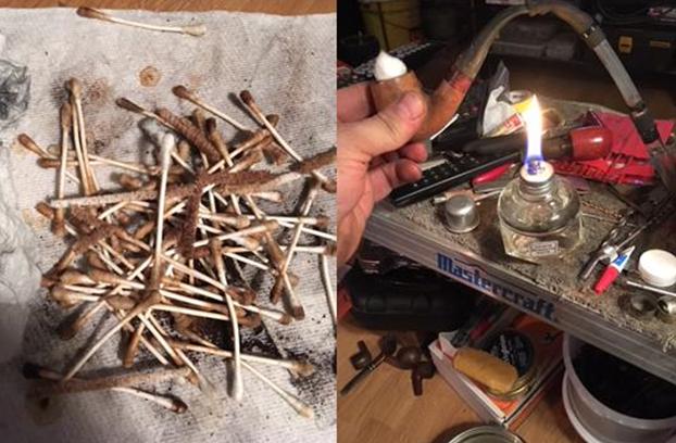 Starting with my Hedge Hog I opened the bowl enough to move on to my Castleford reamer. After reaming the bowl, I used a piece of 220 grit sand paper to level out the bowl (I lost the pics of this process). To my surprise the inner bowl had no scars, no burns or cracks. It was in excellent shape. It smelled like an outhouse but was in excellent shape. Using a 4mm drill bit, I opened up the draft hole. Next using cotton swabs, a shank brush, pipe cleaners and isopropyl alcohol I scrub the bowl and the shank. After cleaning the bowl, it still stank. My wife, actually came downstairs to ask me what I was working on. She could smell the pipe all the way upstairs. In the 300+ estate pipes I have worked on this is the first that could be smelled on another floor. I guess reaming the bowl unleashed the funk. It was off to the retort to remove the smell. It took four test tubes of alcohol before it came out clear.