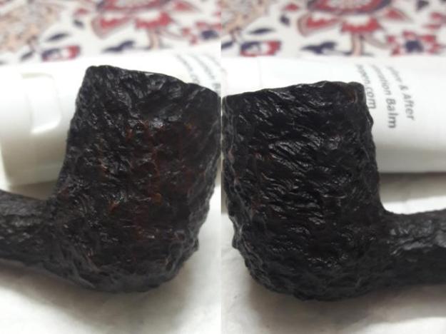 Next morning, I rubbed a Before and After Restoration Balm with my fingers and worked it deep into the rustication. After a few minutes I cleaned and polished it using a soft cotton cloth. The briar really began to look good. I further buffed it using a horse hair shoe brush till the bowl began to shine a bit. Finally, I rubbed a tiny amount of HALYCON II WAX on the bowl and waited a few seconds. Thereafter, using a microfiber cloth and plenty of muscle power over a prolonged period of time, I was finally satisfied with the way the bowl looked at this stage (pics).