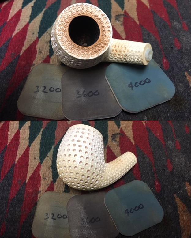 I then sand the stummel with micromesh pads. I wet sand using pads 1500 to 2400, and then dry sand with pads 3200 to 4000 and 6000 to 12000. To protect the Peterson’s nomenclature, I stay clear of the until the later pads – and even then, a very light touch.
