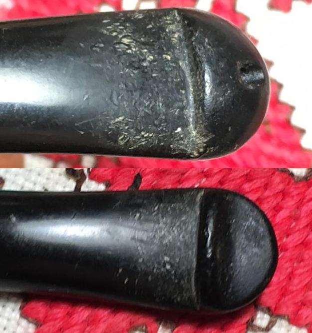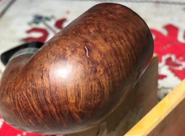 As you can see in the pictures above and the focused one immediately below, the nickel ferule of this Pete needs help dealing with the corrosion – it is an eyesore. Care must be given because metals can be a bit tricky. One approach that works for silver might turn another metal black! After doing some quick ‘How to clean/polish nickel plating’ searching on Google, the approaches I found were helpful. The general theme is to start conservatively and then to work more aggressively – that is, simply washing the nickel with warm water (every source warned about the need to use warm water with nickel – not hot nor cold) and a mild liquid dish detergent. I do this to begin, and it does brighten the ferule but does not help with the corrosion. The next step is to make a paste using baking powder (a mild abrasive and acidic) with water. This I do next with better results. At first, I have too much water, but eventually I find the ratio to create a thicker paste. I then apply the paste with my thumb and work it in around the entire ferule but concentrating on the corrosive spots – the main one being over the ‘Peterson’s’ stamp. Afterwards, I gently rinse the ferule with warm water. I like the progress, but I return to the paste and this time use a cotton pad dipped a bit into the paste and use it in a circular motion over the spot and then rinse. I buff the ferule with a cloth and I like the results! The corrosion on the nickel is greatly reduced and the ferule looks shinier – but not pristine, still holding some scuffs from life. I think this is good because he is an older Pete after all!