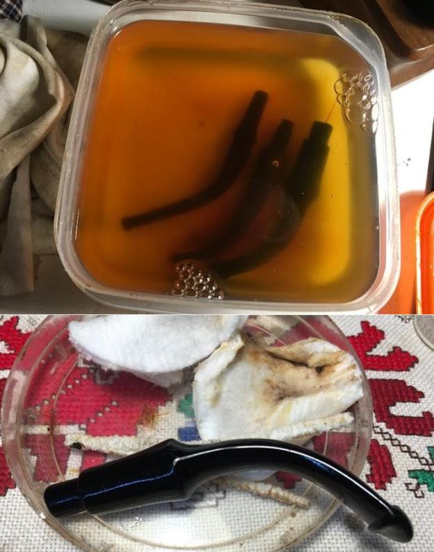 I begin the restoration of this Peterson by first adding the stem to a soak of Before and After Deoxidizer along with a Peretti and Comoy’s stem that are in the queue along with their respective stummels. Before I place the stem in the Deoxidizer, I clean the internals of the System Stem P-Lip for the first time, and I now understand some of what I’ve read about the difficulty in cleaning these stems! They are engineered to narrow down toward the button and the P-Lip draft hole is smaller than usual. I read from the Pipedia Peterson article above that Falcon pipe cleaners are thinner and can be used well with these stems. Good to know! With pipe cleaners dipped in isopropyl 95% I clean the stem and this keeps the Deoxidizer from becoming soiled as quickly. I let the stem soak for several hours. After removing the stem, I let it drain of the Deoxidizer and then wipe off the raised oxidation using cotton pads wetted with light paraffin oil. The oxidation wipes off as a nasty brown goo. The System stem looks good after it is wiped down well.