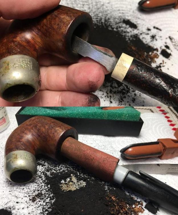 Now, to the rim. I use 240 grit paper rolled tightly and I run it around the outer rim edge to give it a slight rounding to remove the remnants of damage on the rim. I gently pinch the rolled paper over the rim edge with my thumb, so I create the slight bevel. I also do the same, very lightly, to the inside rim edge. I follow by doing the same with a rolled piece of 600 grade paper. Finally, I take the stummel back to the topping board once more on 600 grade paper simply to redefine a crisp line around the rim after the beveling. I think it looks great and ready for the next step.