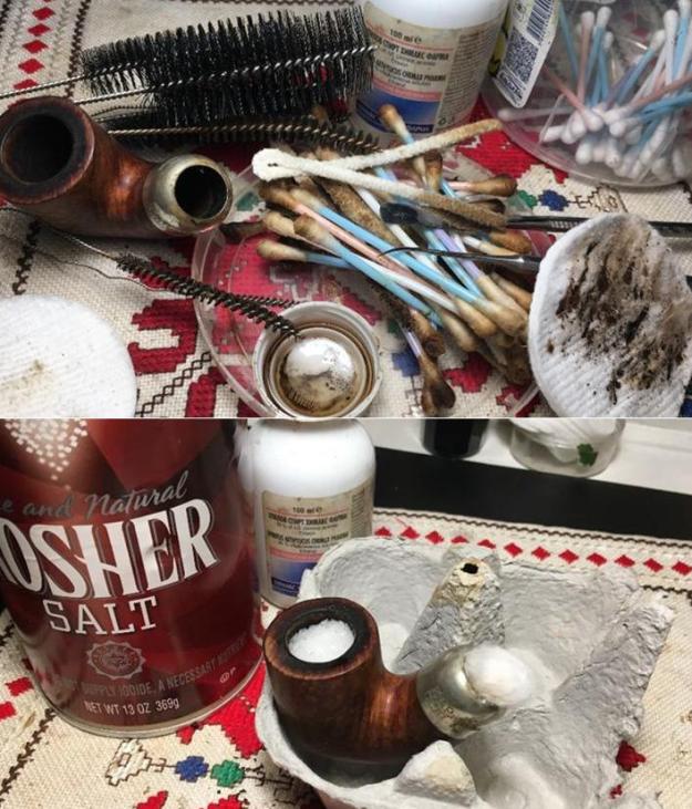 The next morning, the salt-alcohol soak did the job! The salt is soiled, and the cotton wick is full of tars and oils. After dumping the expended salt in the waste basket, I wipe the bowl out with a paper towel and blow through the mortise to loosen and left-over salt. I run a pipe cleaner and alcohol through the draft hole and a cotton bud as well in the sump and the mortise walls to make sure all is clean and I’m happy to report that it is! From this cleaning, I think a wise practice for any Pete steward would be to clean your pipe often! Don’t allow too much gunk to collect in the sump.