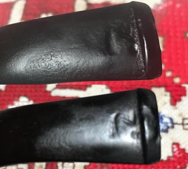 When I look at the stem I see something I didn’t see before. A hole in the stem on the right at the base of the saddle. I’ve never seen this before. I’ll need to patch it as well. I wipe the stem with alcohol to clean the area where I will apply black CA glue to fill the dents. After clean, using a toothpick, I spot drop black CA glue on both dents on the lower bit. The toothpick allows me to control where and how much glue I apply. I wait an hour or so for the glue to set and then turn over the stem and spot drop glue on the ‘saddle’ hole. I set the stem aside for the patches to cure for several hours.