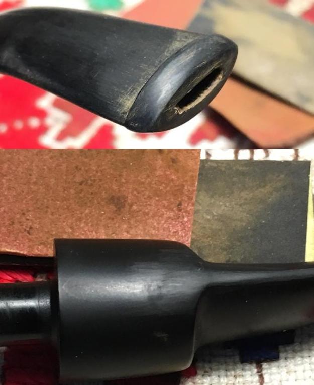 Using 240 sanding paper, I sand both upper and lower bit and the button to see how much of the damage can be sanded out. The heating technique helped more than I realized – good news. The upper bit sanded out completely. The lower bit still shows two dents. Using the flat needle file, I worked on the button and refreshed the upper and lower button lips. The draft hole was dented too. I pull out the topping board with 240 paper on it and ‘top’ the button to flatten it out. I smooth out the draft hole using a rounded needle file. I take a picture to show the progress of the 240 paper and file work.