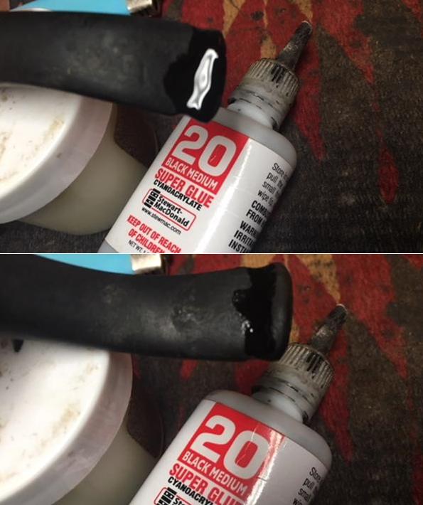 I filled in the remaining dents with black super glue. It would take several applications of the glue to thoroughly fill in and repair the dents. I set the stem aside to let the repair cure and worked on the bowl.