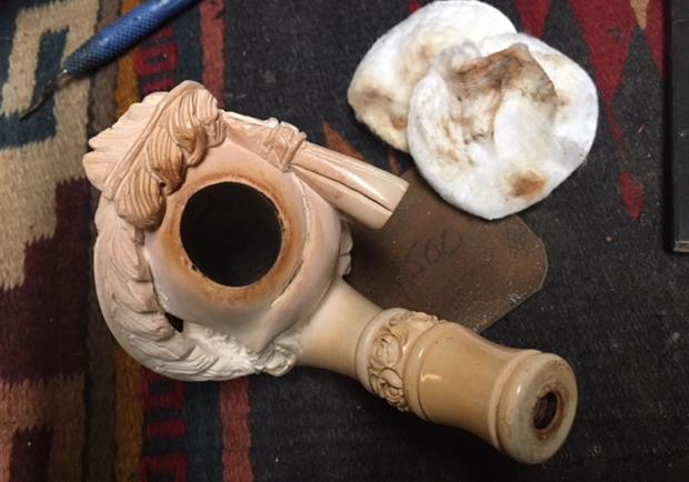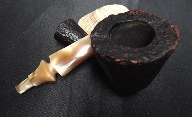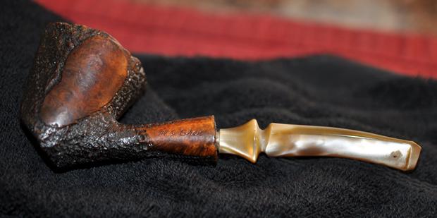 The mixture of sandblast and smooth on the bowl sides and the faux plateau on the rim top of this pipe was covered with dust and grime. The blast and rustication on the rim top was all but filled in with an overflow of lava from the thick cake in the bowl. It appeared that underneath the rim top was in good condition and the inner and outer edge of the bowl was in good condition. The stamping was on the left side of the shank and was clear and read A.J. Sher on a smooth panel. The pearlized Lucite stem had tooth dents and chatter on the top and the underside of the stem. The interior of the pipe was dirty. I could see that George thoroughly enjoyed this pipe along with the others as is evidenced by the wear that all of them show. Jeff took these photos before he started the cleanup work on the pipe.