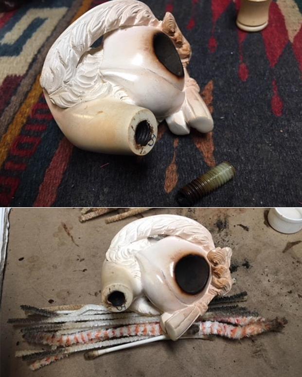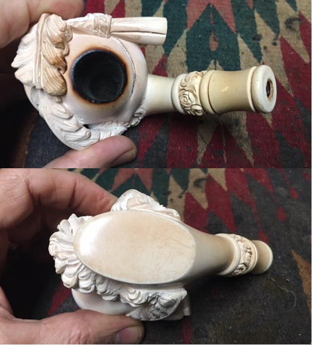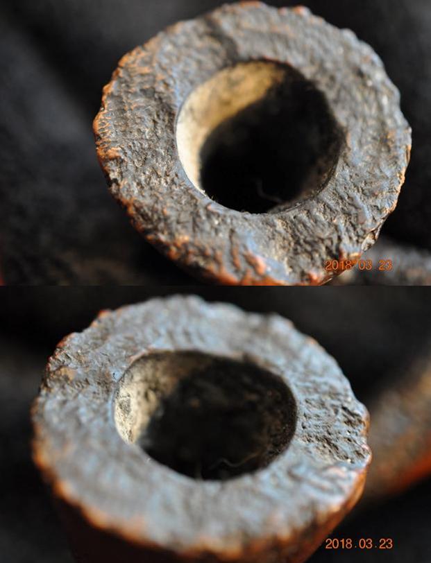 I took close up photos of the bowl and rim top as well as the stem. You can see the condition of the rim top and bowl in the first photo. The top was in excellent condition and Jeff was able to remove all of the lava and oils. He had scrubbed the bowl with a tooth brush and oil soap and it looked really good. The acrylic/Lucite stem had tooth chatter and some bite marks on the top and the underside of the stem just ahead of the button. I was glad to see that there was no bite through on the underside of the stem. What had appeared as a hole in the above photos of the stem seemed to have cleaned off and all that was present was a large tooth mark.