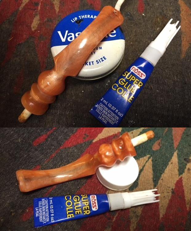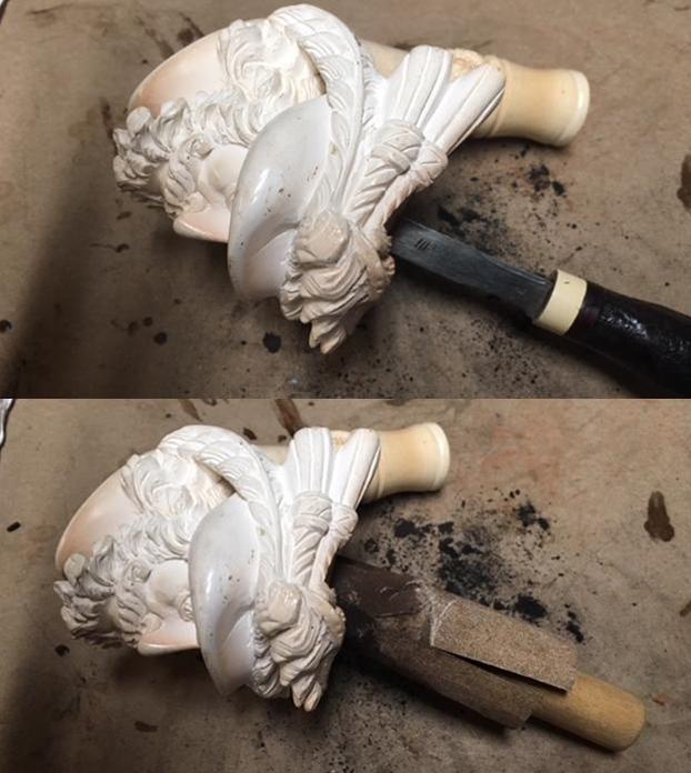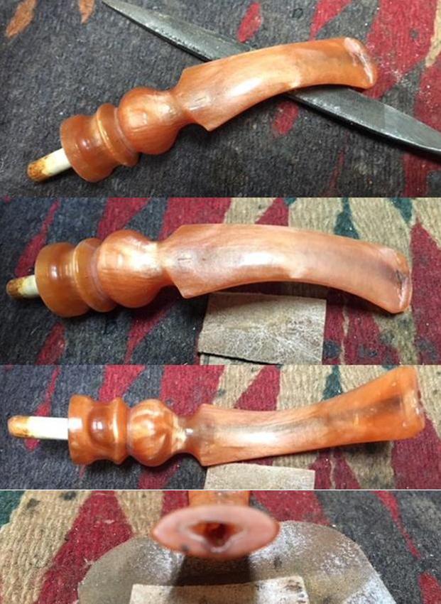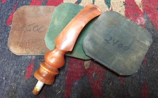 There were some tooth marks on the top and underside of the acrylic stem at the button. Since there was not a hole in the stem it was a pretty easy clean up. I sanded them smooth with 220 grit sandpaper to blend them into the surface of the stem. It did not take too much sanding to remove the marks and smooth out the stem surface. When it was sanded it was smooth and the marks were gone.