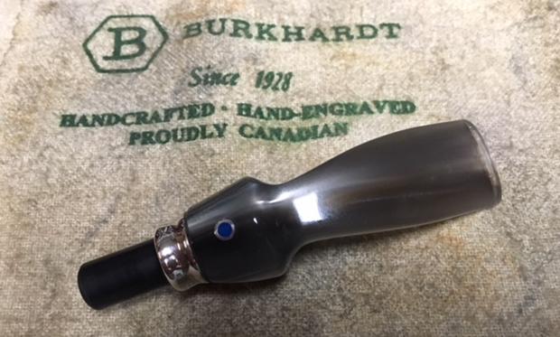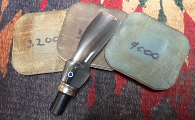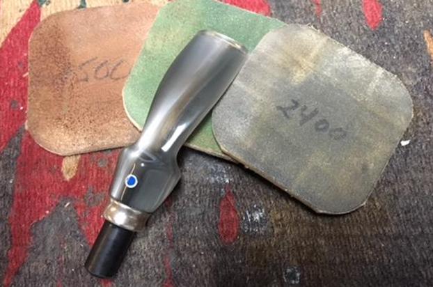 I polished the stem with micromesh sanding pads to remove the scratches in the acrylic. I wet sanded it with 1500-2400 grit pads and dry sanded it with 3200-12000 grit pads. I wiped the stem down with a damp cloth after each sanding pad. I polished the silver band with a jeweler’s cloth.