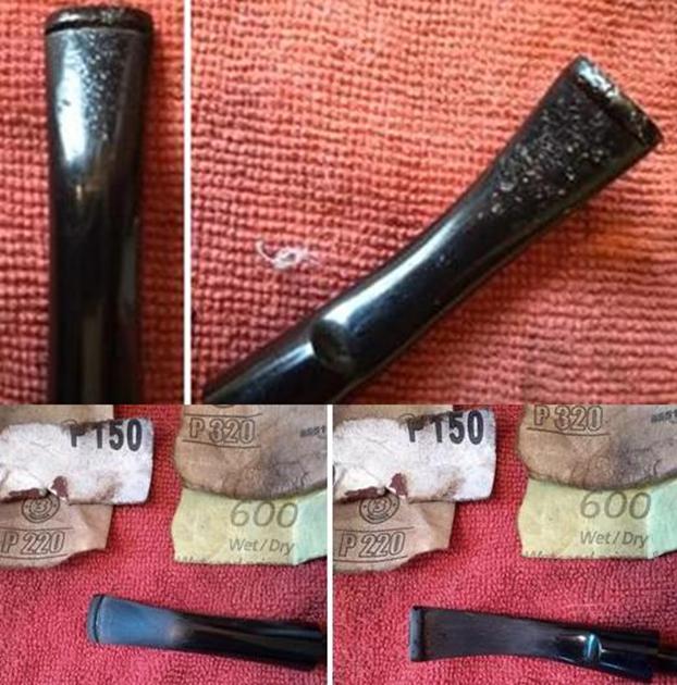 REFURBISH The newfangled calabash is comparable in size to other pipes in one way, having a length of 6”, but the chamber diameter is tiny at ⅝” x ⅝”.  When I first held the pipe and looked it over, I thought it was brand new (pun intended).  But closer examination showed carbon in the little insert bowl chamber and the larger enclosed bottom chamber, and the rim needed some work.  After more than a little consideration, I determined the insert is MDF coated almost all over with whatever maroon finish of which the Chinese are so fond.  It reminds me of a mushroom, truth be told. Unfortunately, after having no success removing the char from the bottom chamber with super fine “0000” steel wool, I escalated the process to 150-grit paper and took off enough of the Teflon-like red finish that there remained no reason not to finish the job.  The steel wool worked well on the rim, though.The plastic stem had been gnawed well below the lip until it was, well, gnarly.  I attacked it with a progression of 150-, 220-, 320- and 600-grit papers, followed by the full power of all nine micro mesh pads and, to finish it off, a buff on the wheel with red and white rouge.  I don’t really know if the last measure did any good.  You be the judge. And that, as they say, was that, except for a quick spin on the wheel to buff the rim.