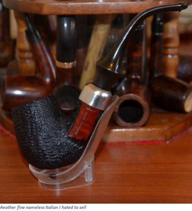 The price I paid for the three has already been compensated with the sale of the top pipe below, a frayed straight brandy I cleaned and dressed up in a shiny black finish and sold for more than the lot cost.  The African meerschaum in the middle that made me desire the lot at all is destined for my own collection.