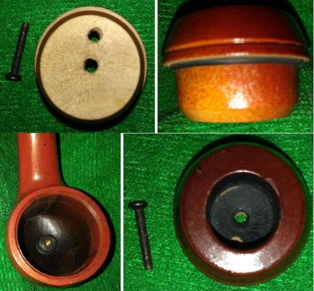The newfangled calabash is comparable in size to other pipes in one way, having a length of 6”, but the chamber diameter is tiny at ⅝” x ⅝”. When I first held the pipe and looked it over, I thought it was brand new (pun intended). But closer examination showed carbon in the little insert bowl chamber and the larger enclosed bottom chamber, and the rim needed some work. After more than a little consideration, I determined the insert is MDF coated almost all over with whatever maroon finish of which the Chinese are so fond. It reminds me of a mushroom, truth be told.