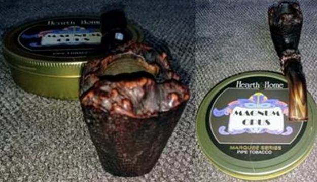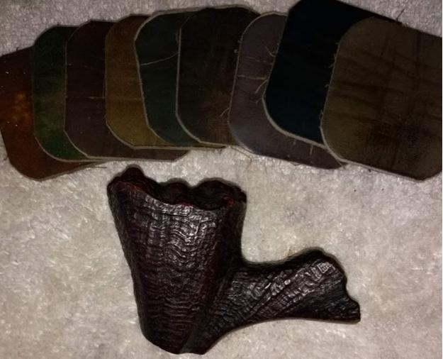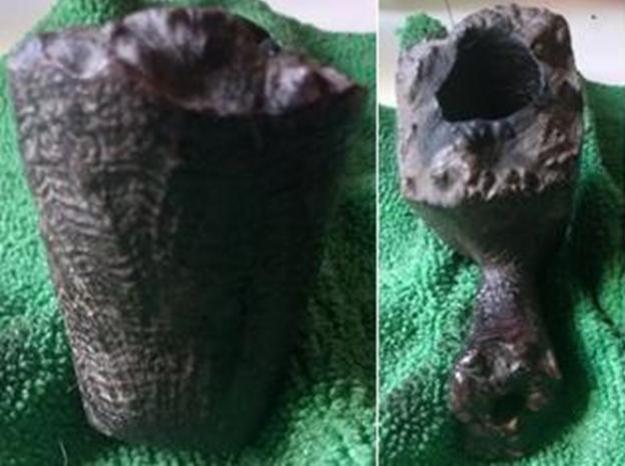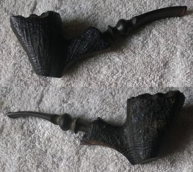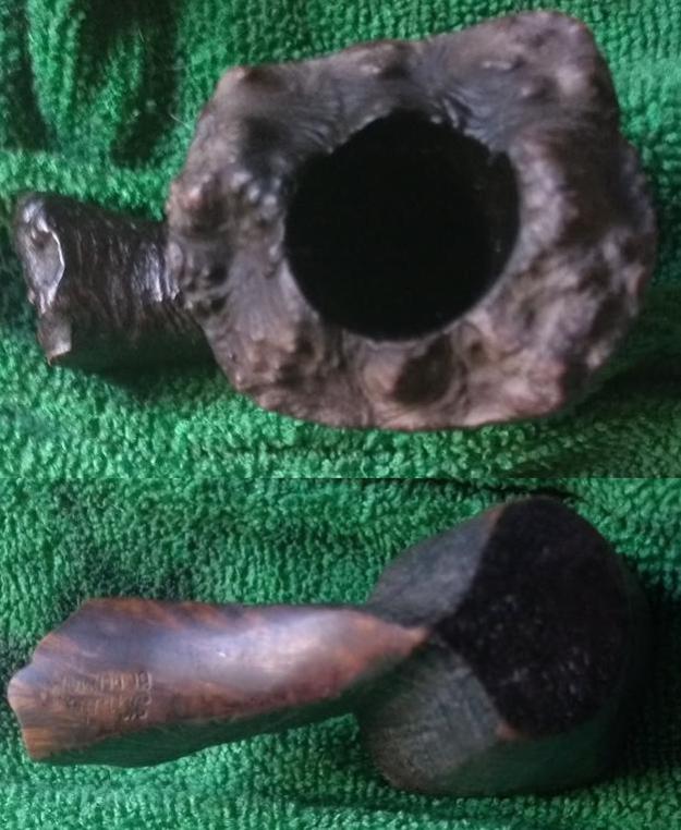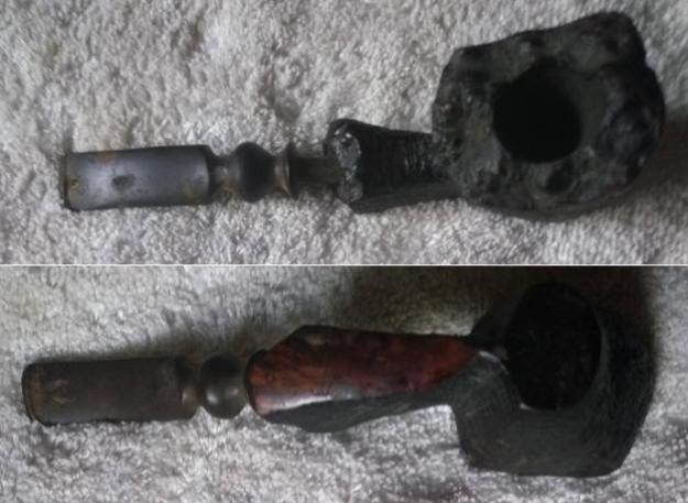 RESTORATION The stem was savagely damaged, with the top lip all but gone and a small hole below it and the bottom having two gouges.  Such long-term acts of mayhem must have been inflicted by someone with clear and severe anger issues who masticated the mouthpiece the way some people chomp on gum to stop smoking coffin nails.  I gave it an OxiClean bath to start.  At the same time, I stripped whatever dirt and stain (the latter of which I could see no signs) were present with an Everclear soak.  The immediate appearance of dark reddish swirls in the alcohol surprised me. The OxiClean soak, which was complete first, shows in the pic below how filthy the stem was.  Afterward, all I can say is it was clean. Figuring I had at least an hour before the stummel would be stripped, I filed off fine shavings from an old otherwise useless stem and made a nice little pile.  The ironic part of that task was that the stem was once a fancy type similar to the one I was fixing and would have been a perfect replacement had it not been toasted!  Then I added a few drops of black Super Glue, mixed it together with the shavings and quickly and liberally applied it to the stem after dipping a cleaner in petroleum jelly and inserting in the mouthpiece past the hole.  WARNING: I forgot my usual process of lubricating a small sliver of card stock paper also and inserting it inside the stem in front of the cleaner, but it all worked out later – with some extreme difficulty. That done, I had 12-24 hours before it would be dried, way more than enough time to finish the stummel that was ready to come out of the Everclear.  Checking out the progress of the alcohol soak, I was amazed by the almost blood red color of the 190-proof grain alcohol and guessed it was from residual maroon stain.For the first time after an Everclear soak, I wiped the still drying wood with a cotton rag saturated with purified water.  The water took longer to dry, but the result was stunning.  Despite the sandblasting, I believe what I beheld was the finest piece of briar I’ve ever seen.  Its natural beauty shone through the crisp dullness. I reamed the chamber, used a small sharp pocket knife to cut away some excess buildup and sanded with 150-, 220, 320- and 600-grit papers, then retorted the pipe. The following shots show the tremendous improvement of the wood’s potential color and glow.  I used the super fine “0000” steel wool in two of the photos only on the rim and shank opening.  But look at the difference. Late that night, with the stem patch dry, I took out one of my files, a narrow triangle with medium-grit flat sides to remove the thick, uneven mess on the top of the stem that is a necessary by-product of the black Super Glue method of hole-filling.  I was also able to remove most of the deep chasms on the bottom of the stem.  I began the smoothing process with a dual 150- and 160-grit sanding pad and regular, rougher 150-grit paper.The effort to salvage the ruined old stem was worthwhile and a good start on a plan of total rehabilitation for personal use, but this pipe is for sale, and I know the more difficult work of re-building the bottom lip will take longer and not, in the end, be suitable to pass off to a buyer.