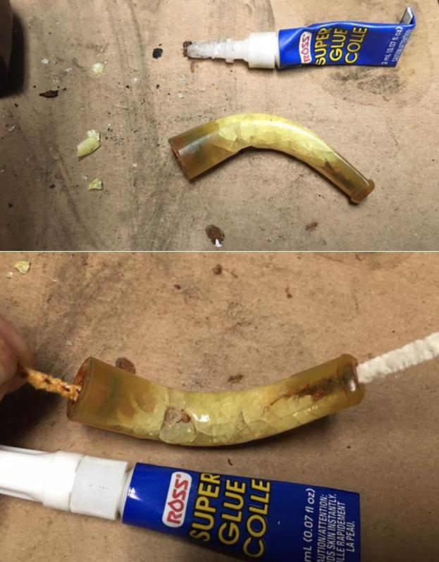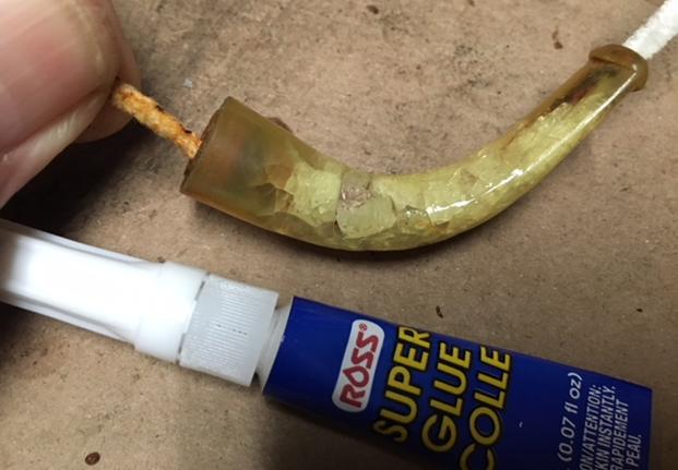 With my day ending, I decide to move forward on the heel fill patches to allow them time to cure through the night. I do additional excavation of the old fill material with a sharp dental probe to remove what I can. I then wipe the area with a cotton pad wetted with isopropyl 95% to assure that it is clean. I mix a small batch of CA glue and briar dust to create a putty. Using a toothpick, I gradually mix the CA glue with the briar dust until it reaches the viscosity of molasses and then apply the briar dust putty to the old fills using a dental spatula. I apply more than needed to create a mound to be sanded down and blended after cured. I set the stummel aside and turn off the lights.