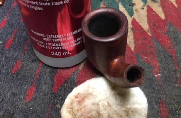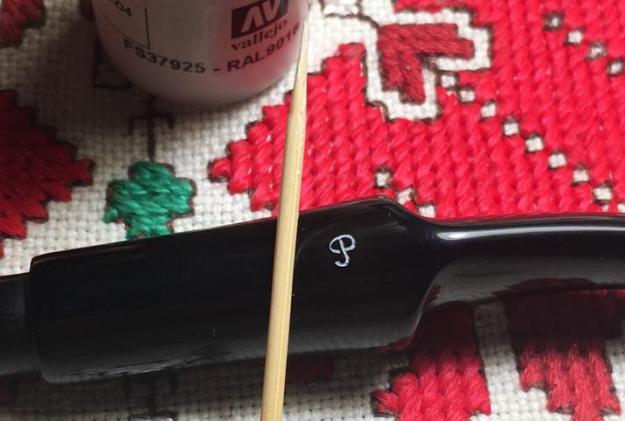 Before I move on to applying the wax, I have one more project. The Peterson ‘P’ stamp on the stem needs some touching up. I use white acrylic paint to do the enhancement. I lightly apply a coat of the paint over the ‘P’ stamping and while still wet, I dab it very lightly with a cotton pad leaving a film – in the second picture below. It doesn’t take long to dry, leaving the ‘P’ filled with paint. I then lightly scrape the dried paint off the surface using the middle, flat section of a toothpick. The toothpick slides over the top of the ‘P’ leaving the freshened stamping. It looks great!