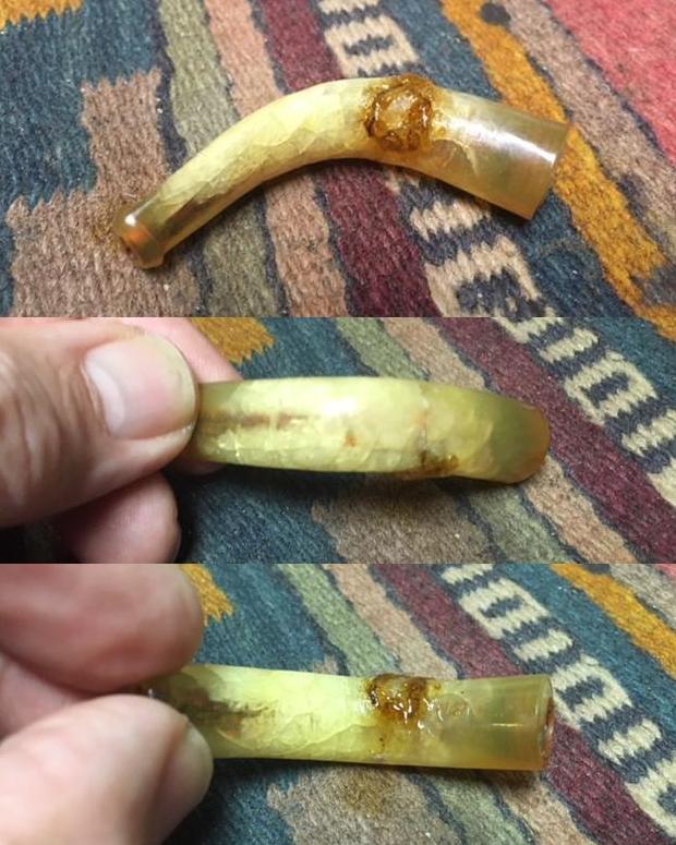 Morning has come and first order of business before heading out for the workday is to pluck the P-Lip military style stem out of the Before and After Deoxidizer bath. I allow the stem to drain for a few minutes then I use cotton pads with light paraffin oil to wipe the raised oxidation off the stem. I also use alcohol to clean the surface as well as with pipe cleaners to make sure the airway is cleared. The Deoxidizer has done a good job, but I still detect oxidation that will require sanding the vulcanite. The button also is rough with a combination of tooth dents and calcification ridges that linger. Of course, the twin ‘pincer’ gashes remain at the mid-stem. The Before & After Deoxidizer bath is the first salvo.