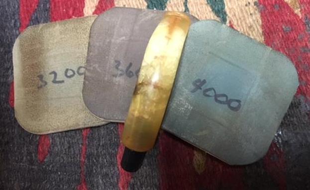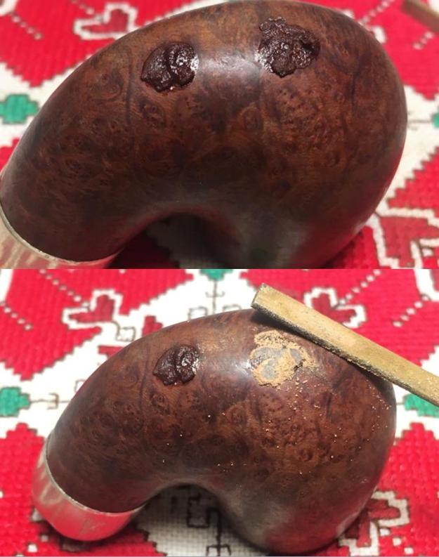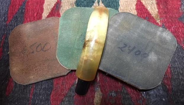 Then, switching to 240 grit paper I continue the sanding process to the briar surface. The picture below shows how after the excess is sanded away, the briar dust putty is left providing a new, stronger fill in the briar blemishes. I then switch to 600 grade paper to finish the sanding to this point.