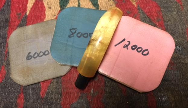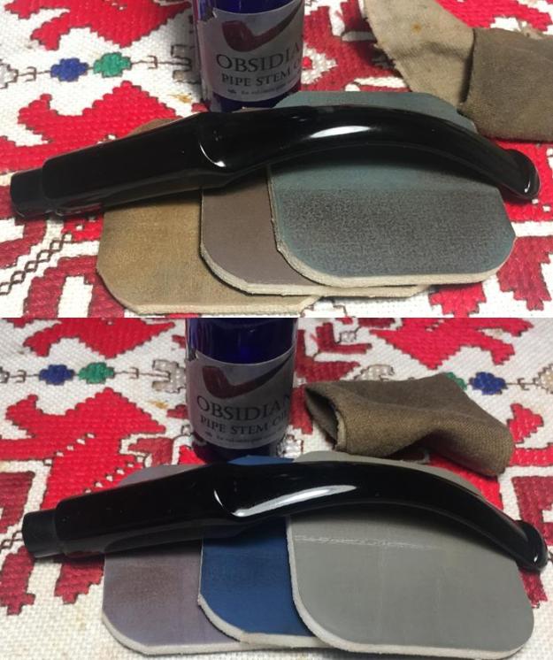 Moving forward, using micromesh pads 1500 to 2400, I wet sand the stem. Following this, I dry sand using pads 3200 to 4000 then 6000 to 12000. After each set of 3 I apply Obsidian Oil to continue refreshing the vulcanite P-Stem. I love the glossy pop of the vulcanite after the micromesh process. I take pictures to show the progress and I put the stem aside to dry.