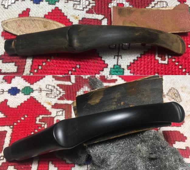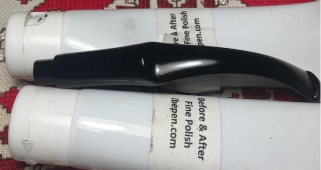 While my focus is still on the stem, I apply Before & After Fine Polish, working the polish in with my fingers. After letting it set a few minutes I wipe the polish off with a cotton pad then in the same way, apply Before & After Extra Fine Polish and let it absorb for a few minutes. I then wipe it down again with a cotton pad. These polishes not only help to revitalize the vulcanite but also to continue removing the oxidation.