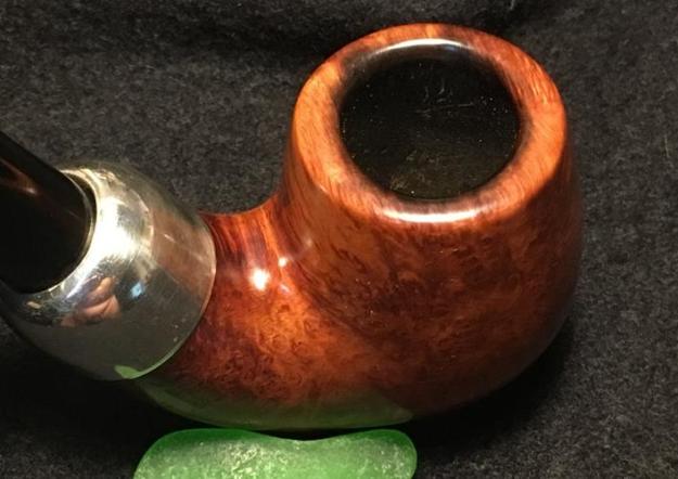 The darkened areas on the rim (picture above) are residual effects of scorching. To minimize this, I will cut an internal rim bevel to remove the damage as well as adding a touch of class to this already classy Peterson’s System Standard. I start with a coarse 120 grit paper to do the initial beveling. I pinch the rolled piece with my thumb and rotate it around the internal rim circumference creating the even bevel. I follow the 120 paper with a rolled piece of 240 grade paper then 600. I repeat the same process for the external rim circumference. The bevel looks good. The pictures show the progression.