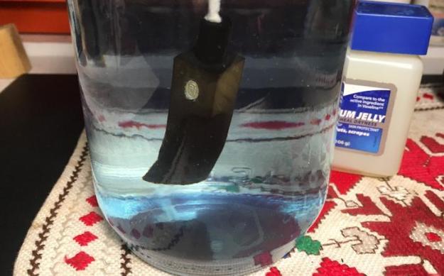 I decide to give the stem another soak in an OxiClean solution. After covering the rondel with petroleum jelly, I put it in the soak. I’m not sure if the brass rondel will react or not to the OxiClean, but I take no chances.