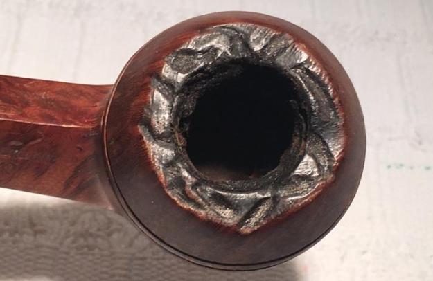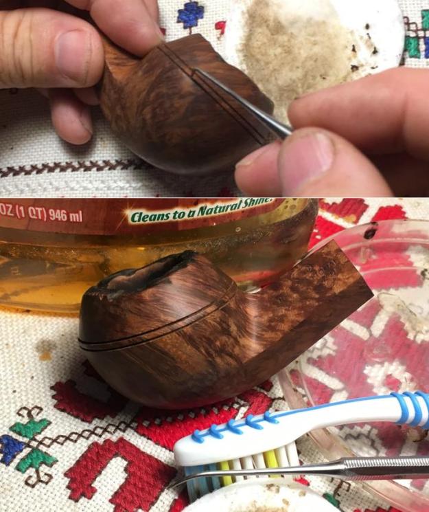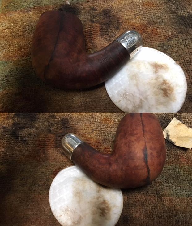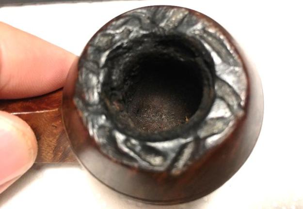 Moving along with the stummel, I use undiluted Murphy’s Oil Soap with a cotton pad to scrub the surface of the briar. To clean the rim, I use a bristled tooth brush with Murphy’s to clean the carved angles and valleys. I then rinse the bowl with cool tap water. The last thing I do is take a sharp dental probe and run it through the twin dome grooves to remove the small debris that had lodged in the grooves. With my wife’s help, I record a picture of this surgery.