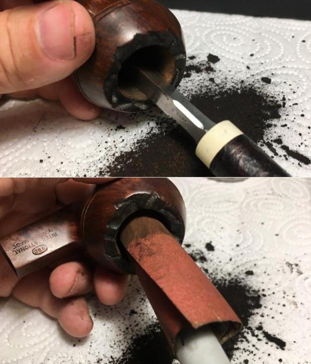 While the stem is in the OxiClean cooker, I turn to the stummel. First, I use the Pipnet Reaming Kit to remove the carbon cake from the Bulldog’s chamber. It takes 2 of the 4 blade heads available in the kit. I follow this using the Savinelli Fitsall Tool to fine tune more by scraping the chamber walls removing more carbon. To get down to fresh briar, I then wrap a 240 grit piece of sanding paper around a Sharpie Pen and sand the chamber. To clean up, I wipe out the carbon dust with a cotton pad wetted with isopropyl 95%. The pictures show the progress.