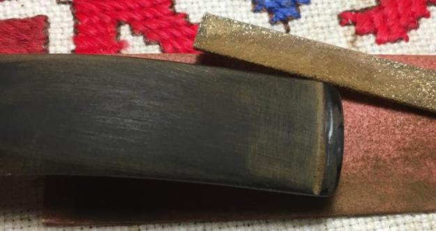 I then use a flat needle file and 240 grade sanding paper to sand down the patches. I use the file to freshen the button – to reestablish crisp button edges.