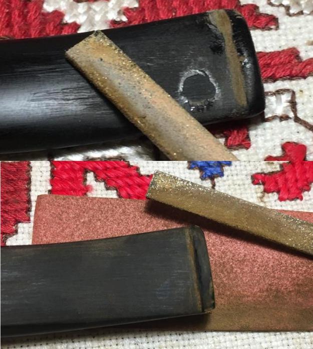The following two pictures show the lower bit/button work – first in progress then completed with filing and 240 paper.
